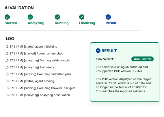 Vulnerability scan and static code analysis is delivered in real-time with a downloadable report available upon scan completion. Pen testing results are rapid, dependent on the specific engagement.